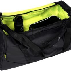 Large professional sports bag with plenty of storage space. Large main compartment with a zipped inner tray for storing smaller items. A zipped side pocket with a mesh opening is used as a wet compartment. There is a side compartment with a zip, a small zipped mesh pocket on top, and a mesh pocket with an elasticated drawstring for stowing water bottles. Robust material that protects against moisture. The bottom material offers additional protection against moisture. Black | 75 x 36 x 36 cm | 97 L Material: 100% Polyester, lining: 100% Polyester