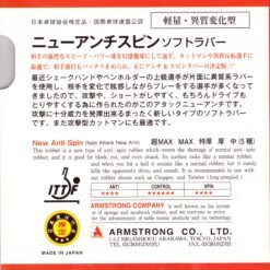 Armstrong New Anti-Spin is good for block, cut and even attack. Its surface looks like normal rubber and when you hit the ball it sounds like normal rubber; but it kills opponent’s drive and smash. Made in Japan.