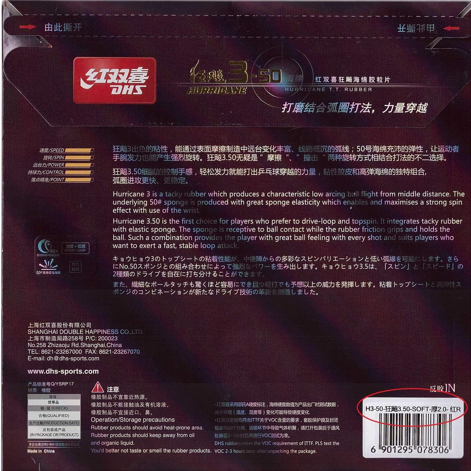Hurricane 3-50 is a tacky rubber which produces a characteristic low arcing ball flight from middle distance. The underlying 50# sponge is produced with great sponge elasticity which enables and maximises a strong spin effect with use of the wrist. Hurricane 3-50 is the first choice for players who prefer to drive-loop and topspin. It integrates tacky rubber with elastic sponge. The sponge is receptive to ball contact while the rubber friction grips and holds the ball. Such a combination provides the player with great ball feeling with every shot and suits players who want to exert a fast, stable loop attack. Now available in soft edition! Hardness is below 37 degrees.