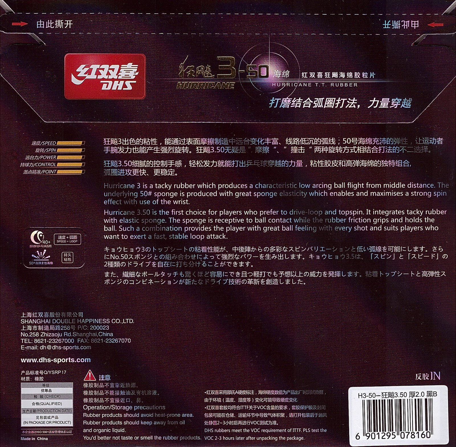 Hurricane 3-50 is a tacky rubber which produces a characteristic low arcing ball flight from middle distance. The underlying 50# sponge is produced with great sponge elasticity which enables and maximises a strong spin effect with use of the wrist. Hurricane 3-50 is the first choice for players who prefer to drive-loop and topspin. It integrates tacky rubber with elastic sponge. The sponge is receptive to ball contact while the rubber friction grips and holds the ball. Such a combination provides the player with great ball feeling with every shot and suits players who want to exert a fast, stable loop attack.