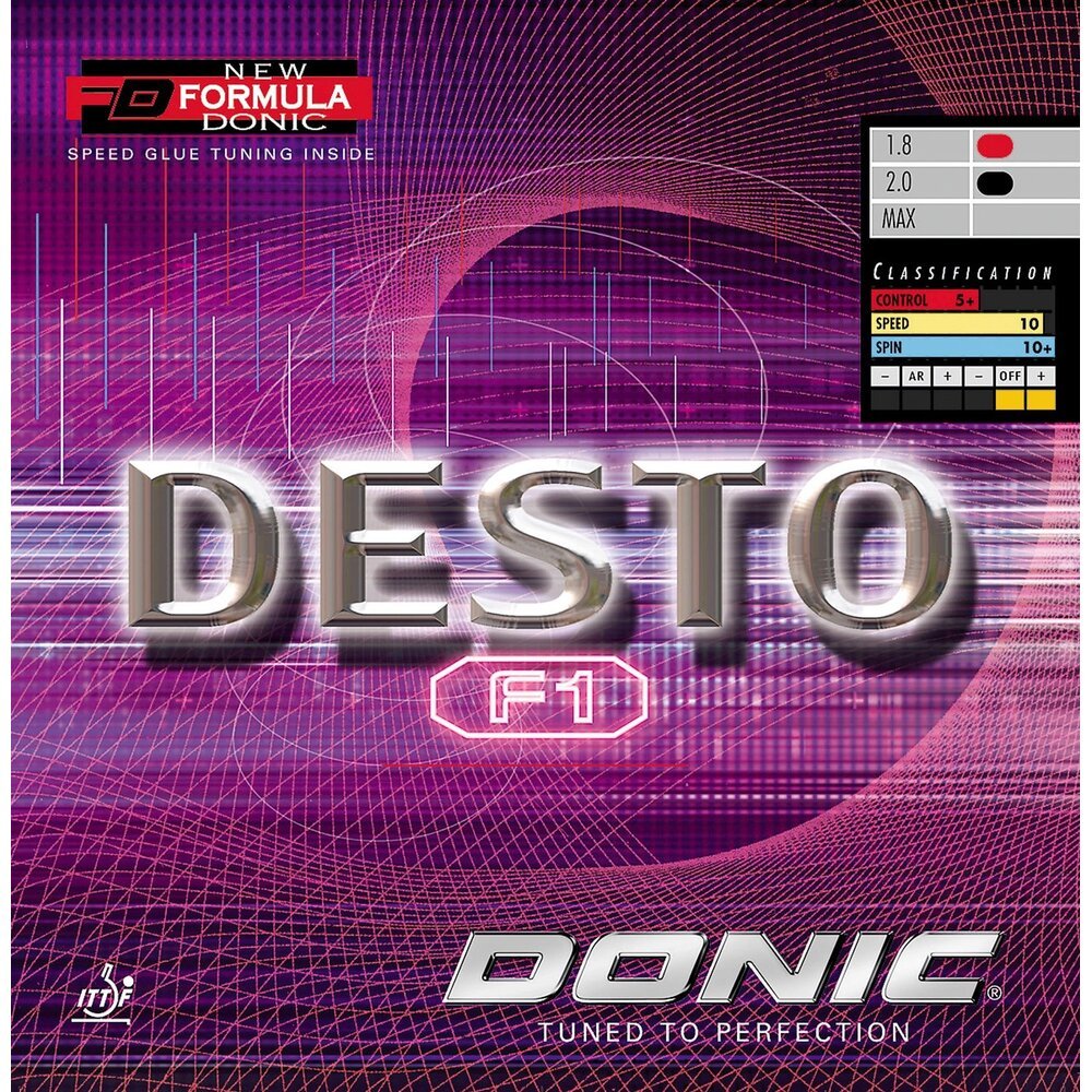 Donic Desto F1 is the fastest rubber from the Desto series. This rubber has a built in speed glue effect with a noticeable sound and leans on the softer side in feel. This rubber is ideal for players looking for that classic speed glued feel resulting in a highly offensive weapon.