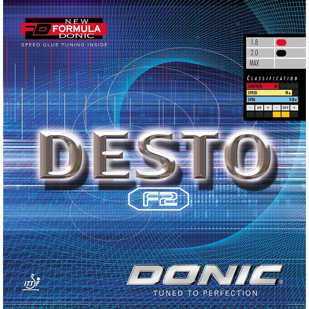 DONIC DESTO F2 is the bridge between F3 and F1, giving great control at high speed. DONIC DESTO F2 is soft, has a good feel and the full sound of speed glueing. It produces far more speed than the traditional spin elastic rubbers, and the F3. It is, however, slower than DESTO F1. The DONIC DESTO F2 is soft and full of feeling, it has the speed glueing kick and of course, the excitement at play of the FORMULA DONIC technology. The DONIC DESTO F2 is for the player who in the past has used the traditional spin elasticated rubber, but is searching for more playing fun and more speed and spin. Players who find the DESTO F3 a little too slow, but find the DESTO F1 just a little too fast will discover that the DESTO F2 will give that extra edge to all aspects of their game that they have been searching for.