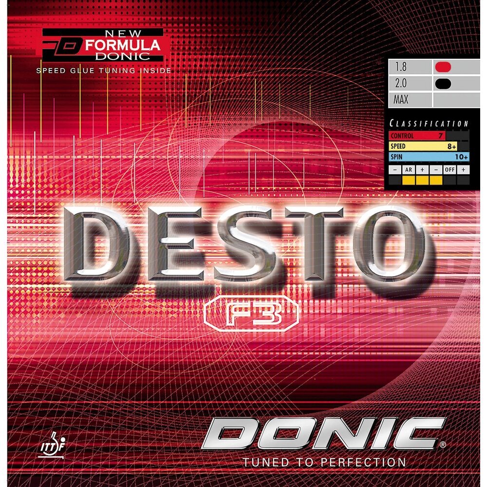 DONIC DESTO F3 has the special playing qualities of the FORMULA DONIC series. It is somewhat faster than a traditional spin elastic rubber. This rubber is soft and dynamic, has excellent control, and the sound of speed glue. We recommend DONIC DESTO F3 rubbers to the following players: Players who used to play with spin elastic rubbers without speed glue will have no adjustment problems by switching to DONIC DESTO F3. Players who have used speed glue, will find that using DONIC DESTO F3 offers an alternative to speed glue.