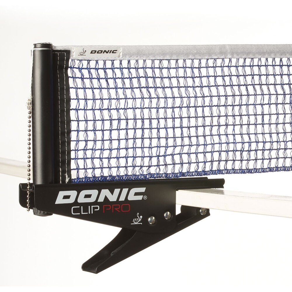 Extremely robust ITTF approved competition net set made of sheet steel for long-term use. Easy and quick assembly by clamping through spring force (clip system). Inner net with tension cord. Height adjustment by height adjustment screw. Suitable for tables up to 25mm table top (not suitable for DONIC Waldner Premium 30 table).