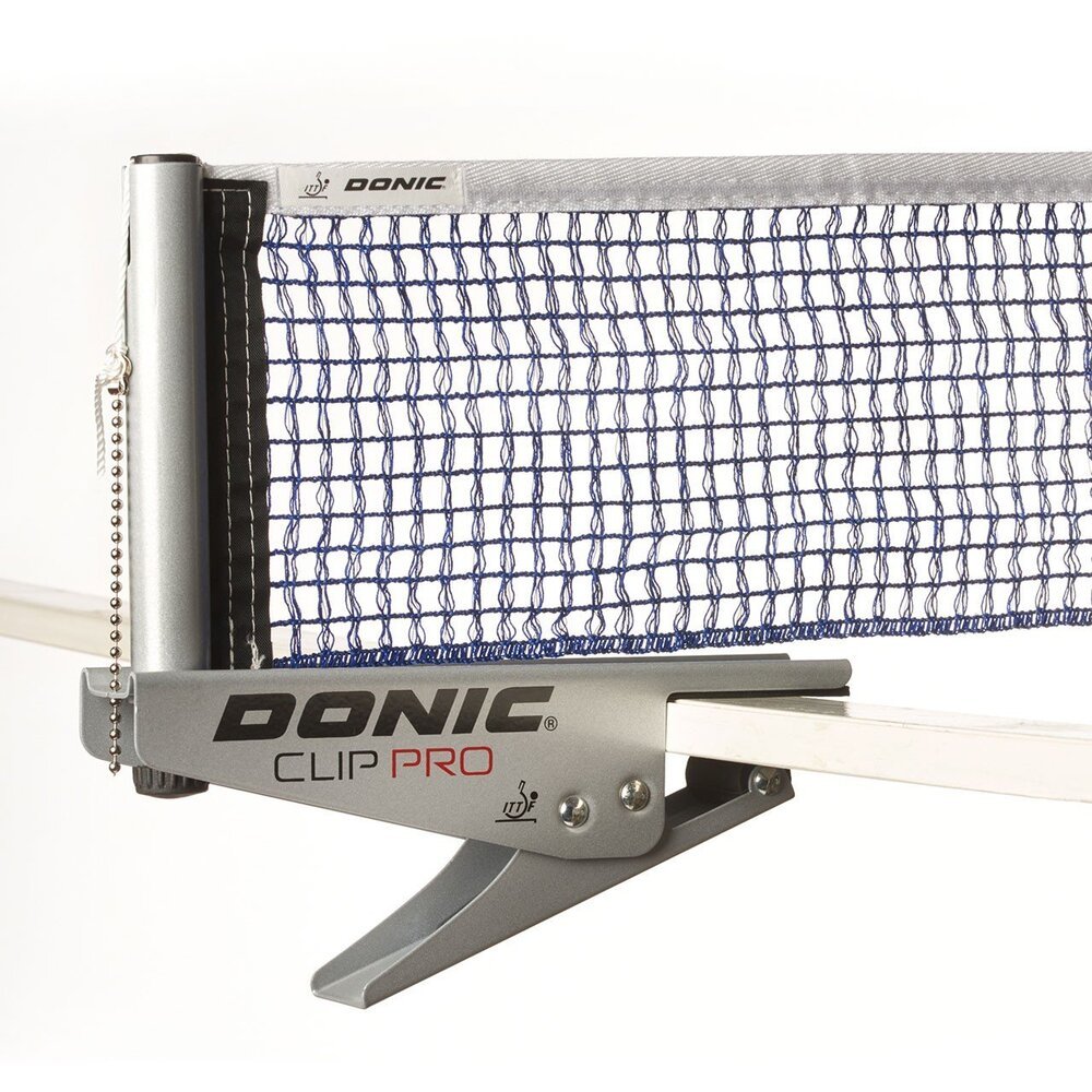 Extremely robust ITTF approved competition net set made of sheet steel for long-term use. Easy and quick assembly by clamping through spring force (clip system). Inner net with tension cord. Height adjustment by height adjustment screw. Suitable for tables up to 25mm table top (not suitable for DONIC Waldner Premium 30 table).