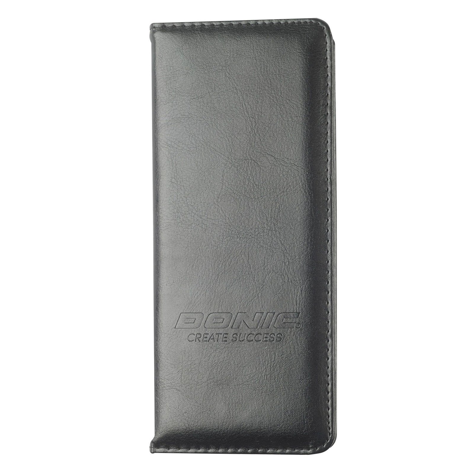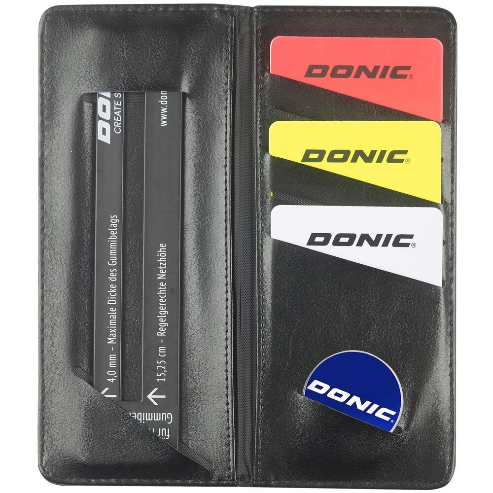 The Donic Umpire Set includes essential equipment for match officiating, featuring two white, yellow, and red cards each, a net gauge, and an umpire’s coin, all neatly packed in a leather case.