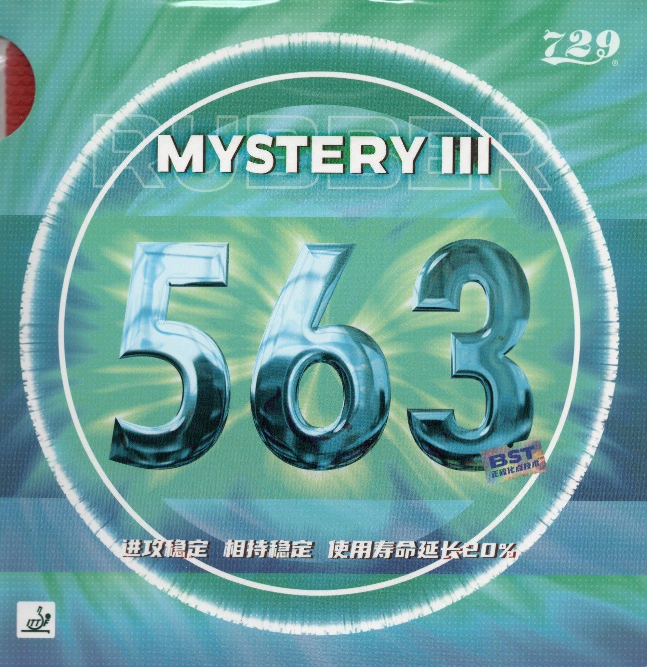 The 729 563 Mystery III is a medium pips-out rubber combining the classic 563 topsheet with the lively Mystery III high-tension sponge. It offers a perfect mix of control, speed, and disruptive effect, making it ideal for close-to-table blocking, counter-hitting, and controlled attacking. The tensioned sponge adds extra power and stability for versatile offensive play.