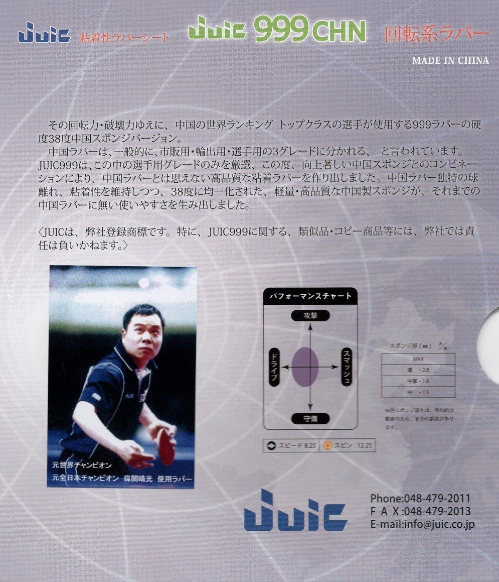 The JUIC 999 CHN is a highly regarded table tennis rubber known for its tacky surface and excellent control. Designed in collaboration with top Chinese players, it offers a traditional sticky topsheet combined with a medium-hard sponge, making it ideal for spin-focused players. The rubber excels in close-to-the-table looping and counter-attacks, providing a strong grip on the ball for heavy topspin shots. Its consistent performance and durability make it a popular choice among players seeking a classic Chinese-style rubber with reliable feel and precision. Made in China.