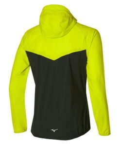 Wind and waterproof jacket for outdoor exercise and casual wear. Produced from 20K rated waterproof and 25K rated breathability fabric. Equipped with rear mesh openings for better ventilation. The reflective Mizuno logo provides better visibility in the dark. Material: 100% nylon. Colour: evening primrose / black.