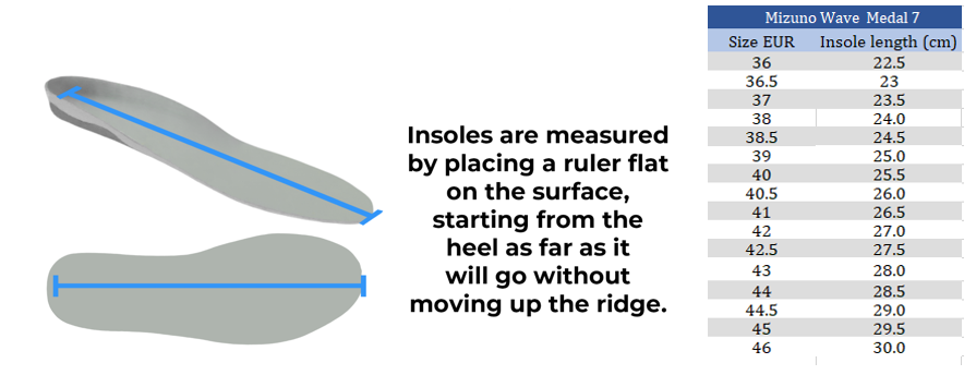 The 7th generation of the WAVE MEDAL in a new white/blue color. Insoles are measured by placing a ruler flat on the surface, starting from the heel as far as it will go without moving up the ridge. Please contact our support team in case of any questions.