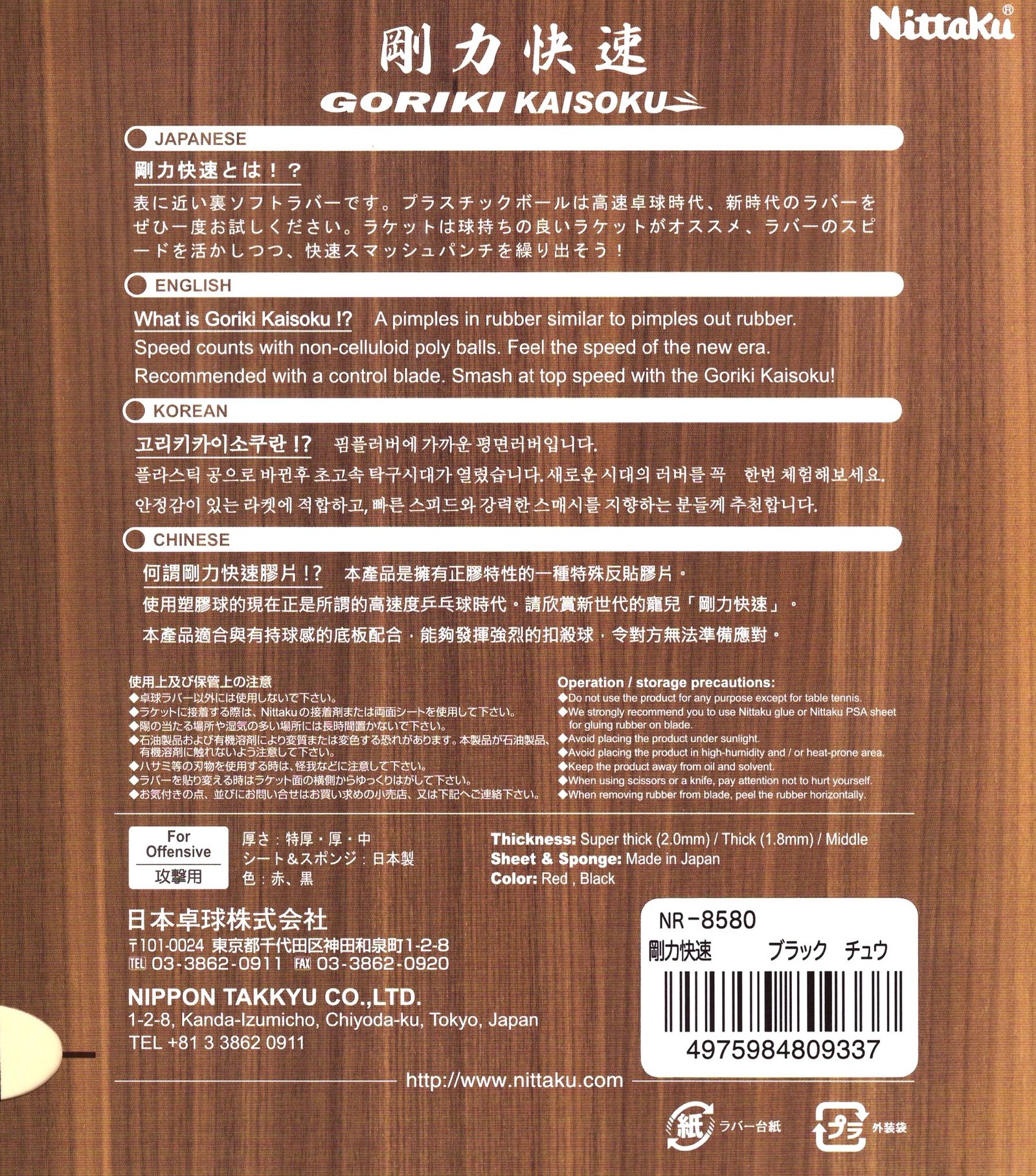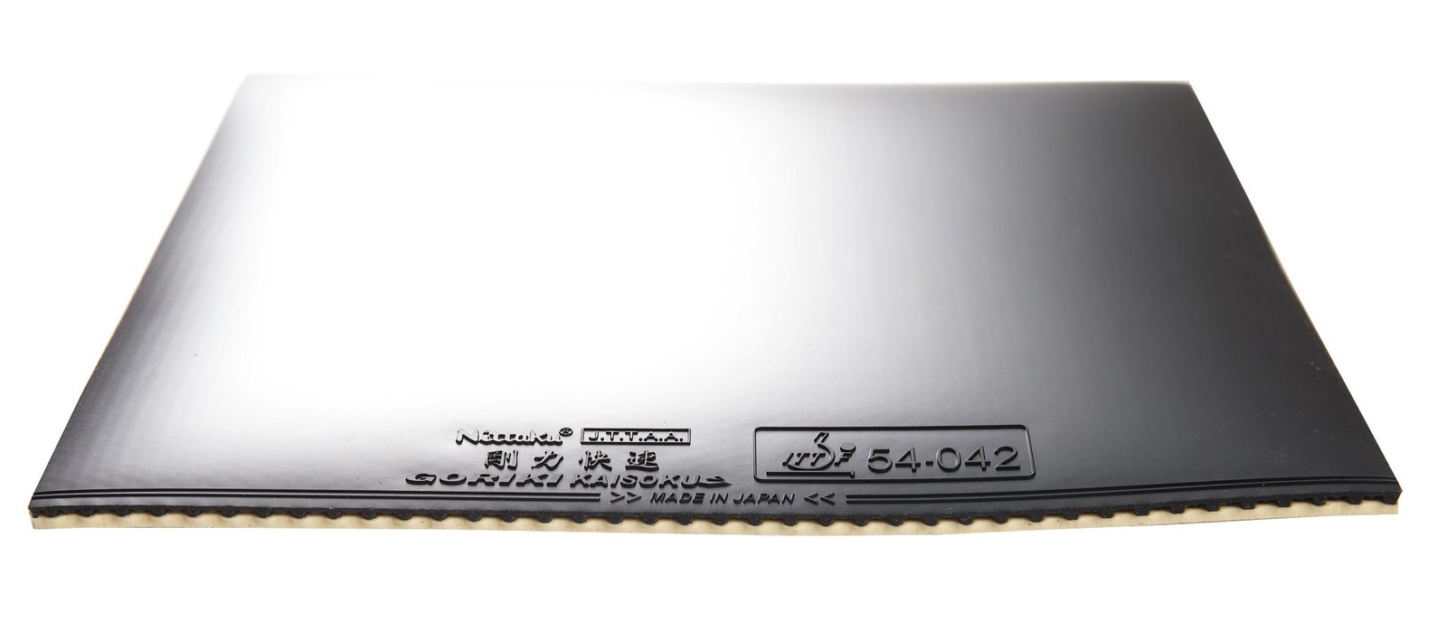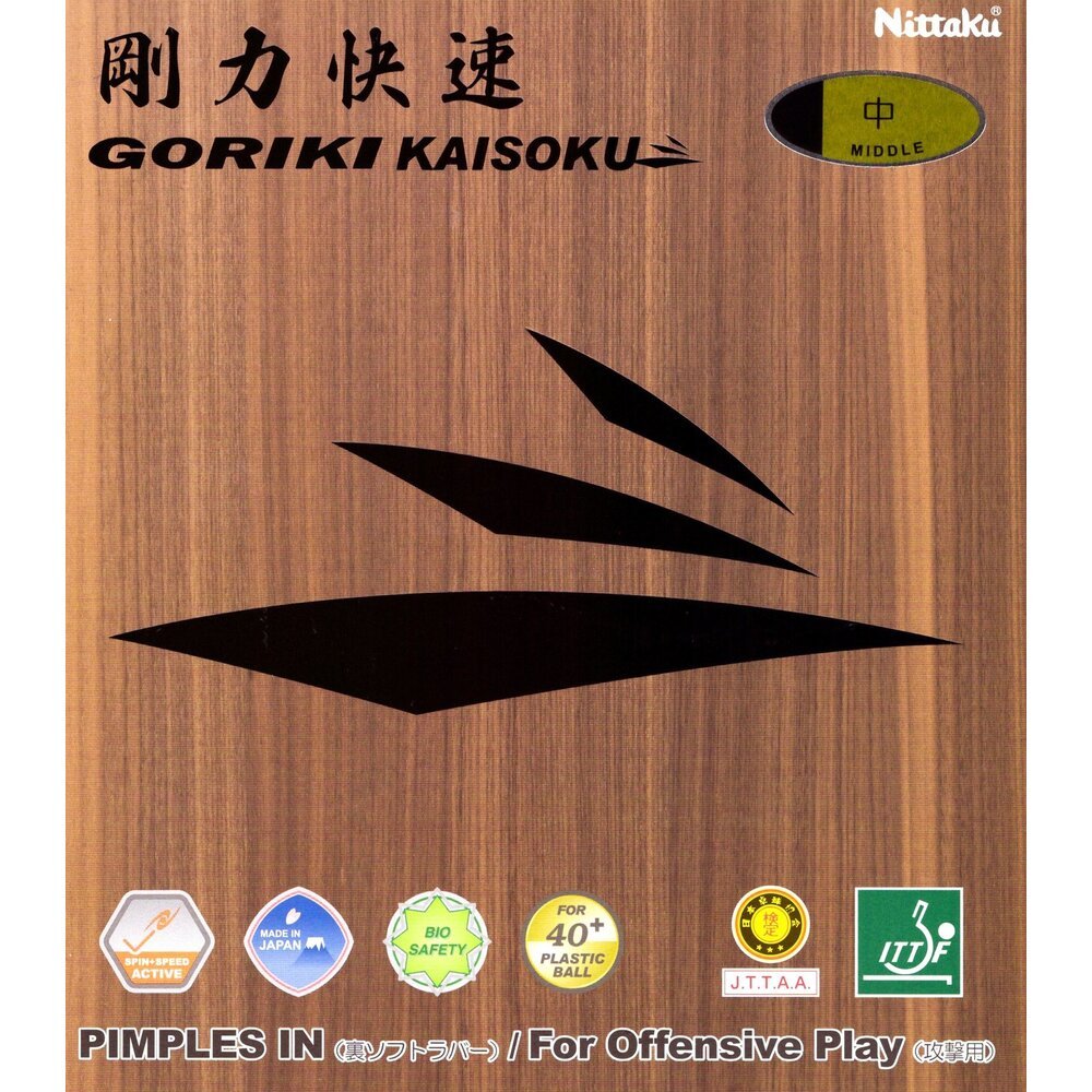 The Nittaku Goriki Kaisoku is an inverted rubber that shares characteristics with short pips. This rubber has been designed for smashing, flat hitting, and driving. Intended for an aggressive playstyle, it is suited for players looking to play quickly close to the table. Made in Japan.