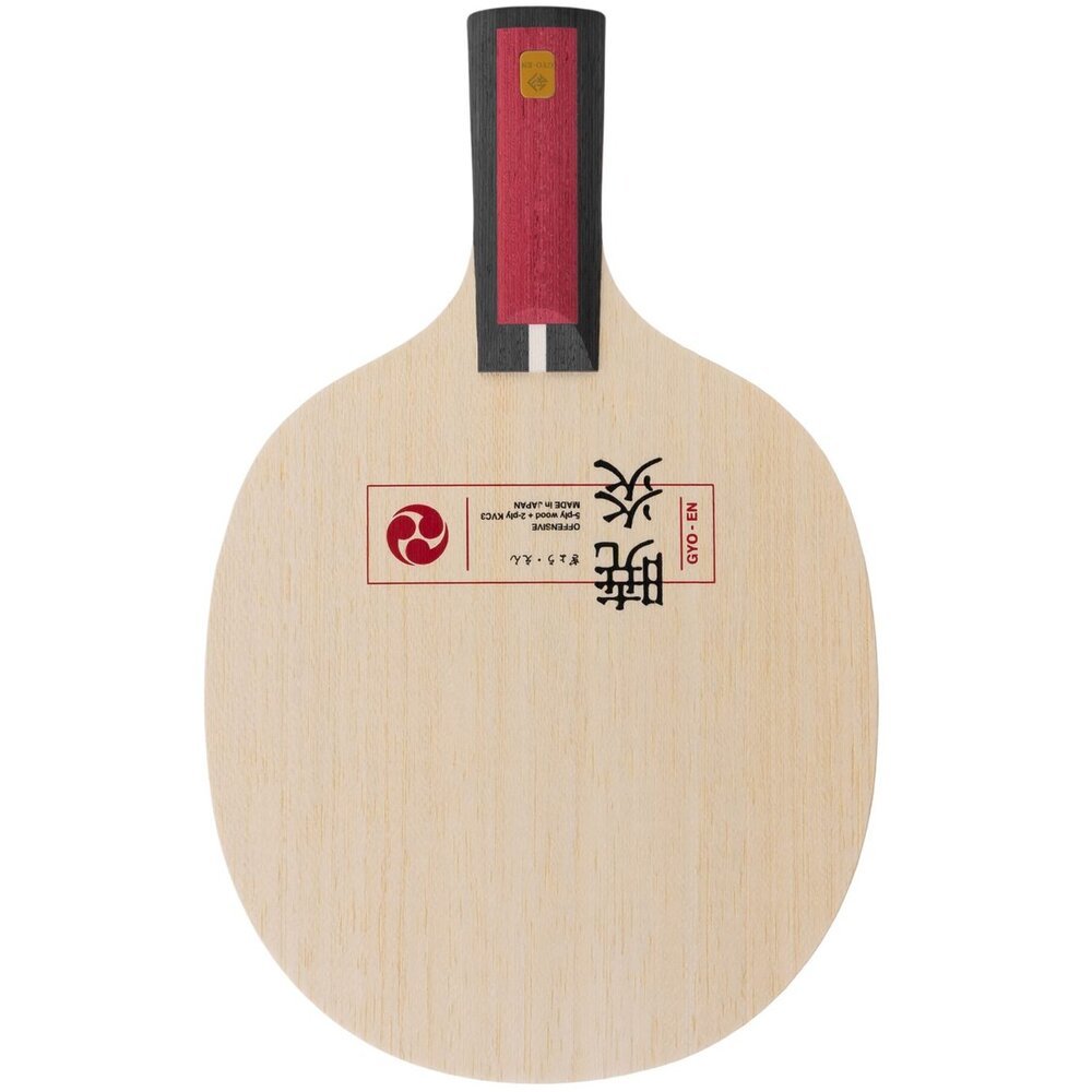 Nittaku Gyo-En is an outer type of blade with KVC3 carbon fibers placed directly under hard wood outer plies. Outer type blades have the carbon ply under one layer of wood, while inner type blades have the carbon ply under two layers. This construction ensures it is lightweight but offers a lot of speed and power due to KVC3 carbon properties. The size of the blade is 157 x 150 mm. Made in Japan.