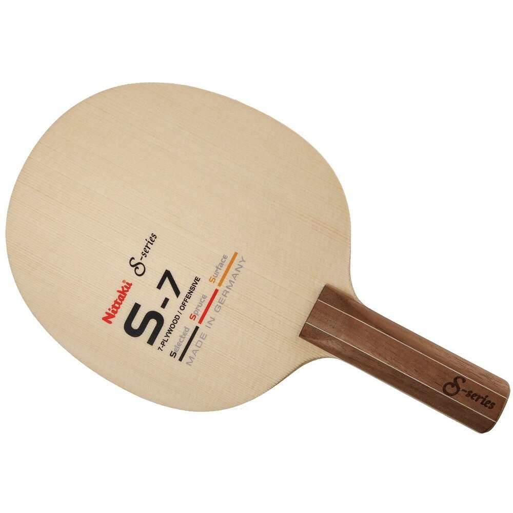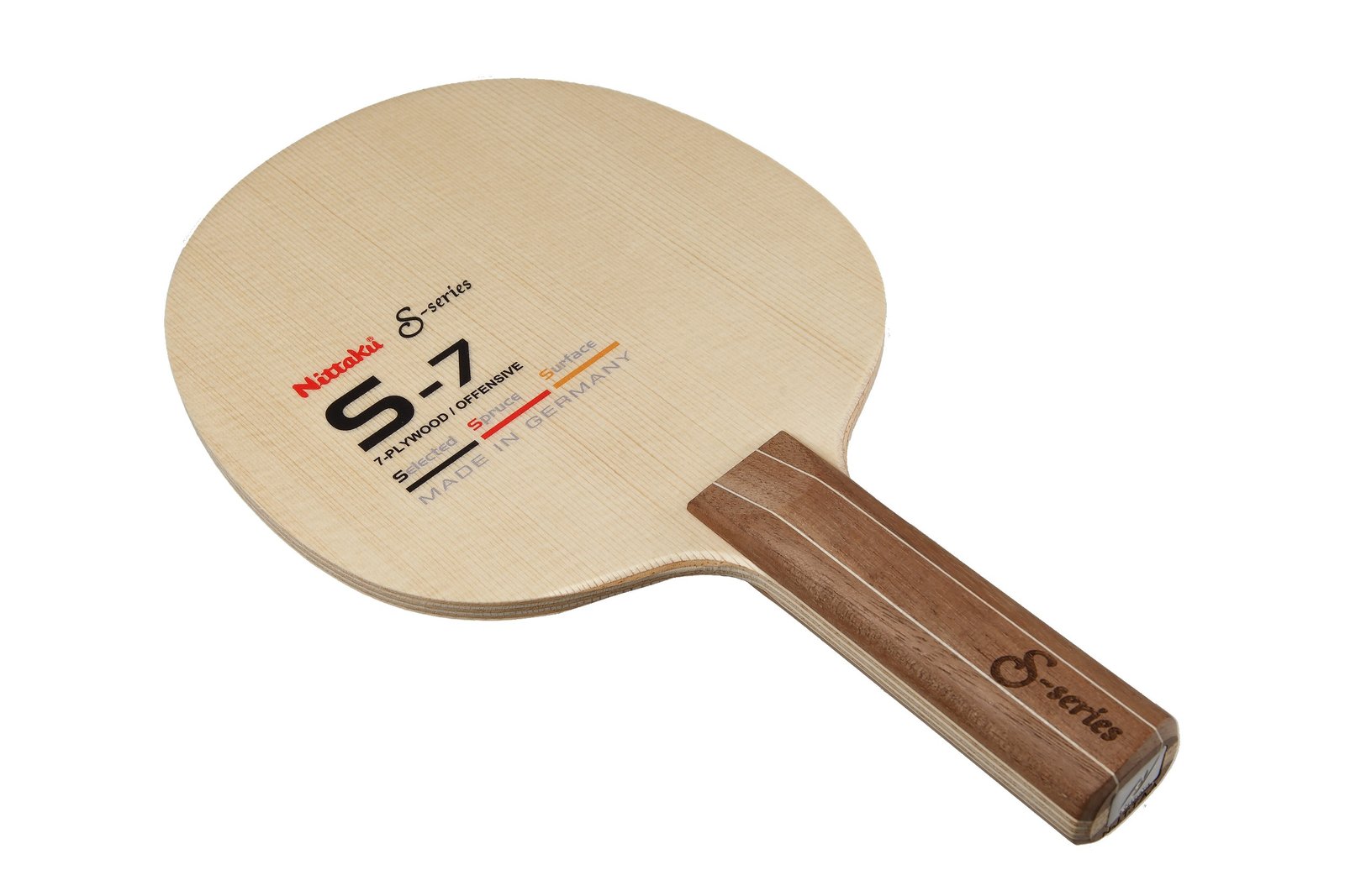 The Nittaku S-Series S-7 is the perfect combination of German Craftmanship and European Spruce wood. This is a classical 7 ply blade that has opted to use Spruce wood together with African wood. Spruce trees are famed for their use in musical instruments and these same qualites make the wood perfect for table tennis blades. With the S-Series Nittaku introduces an affordable blade that is made from the highest quality wood. The S-7 is a fast blade made from 7 plies of Spruce and Ayous wood. A laser mark seal protects the beauty of the American Walnut wood handle. Made in Germany.