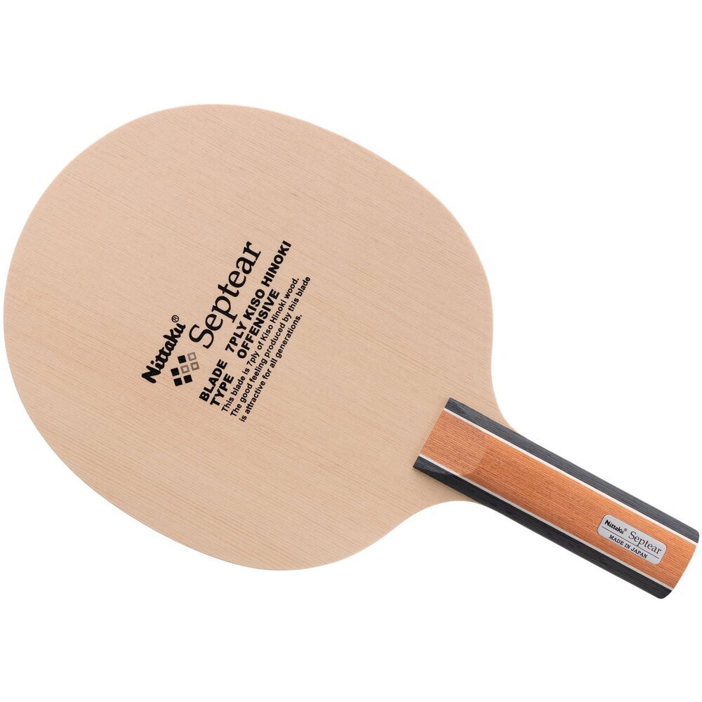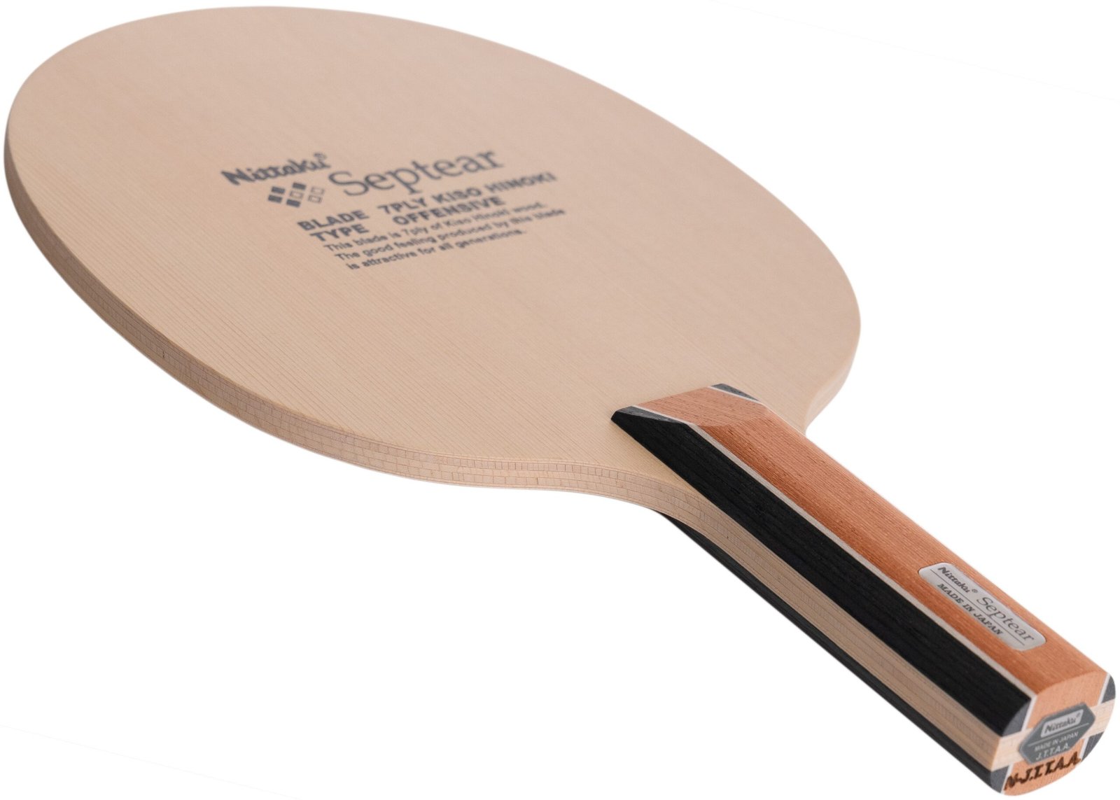 The Nittaku Septear is a 7 ply blade made from Hinoki wood. Hinoki is usually only used sparingly but this blade sets itself apart from the rest by using only Hinoki in its construction. The 7 plies and thick construction notwithstanding, the Septear is surprisingly light. It is a fast offensive blade with a soft touch and works well with a topspin oriented game. Nittaku has changed the lens design of the blade, but the blades themselves remain the same. Once we run out of the old lens design, we will begin sending out the new version.