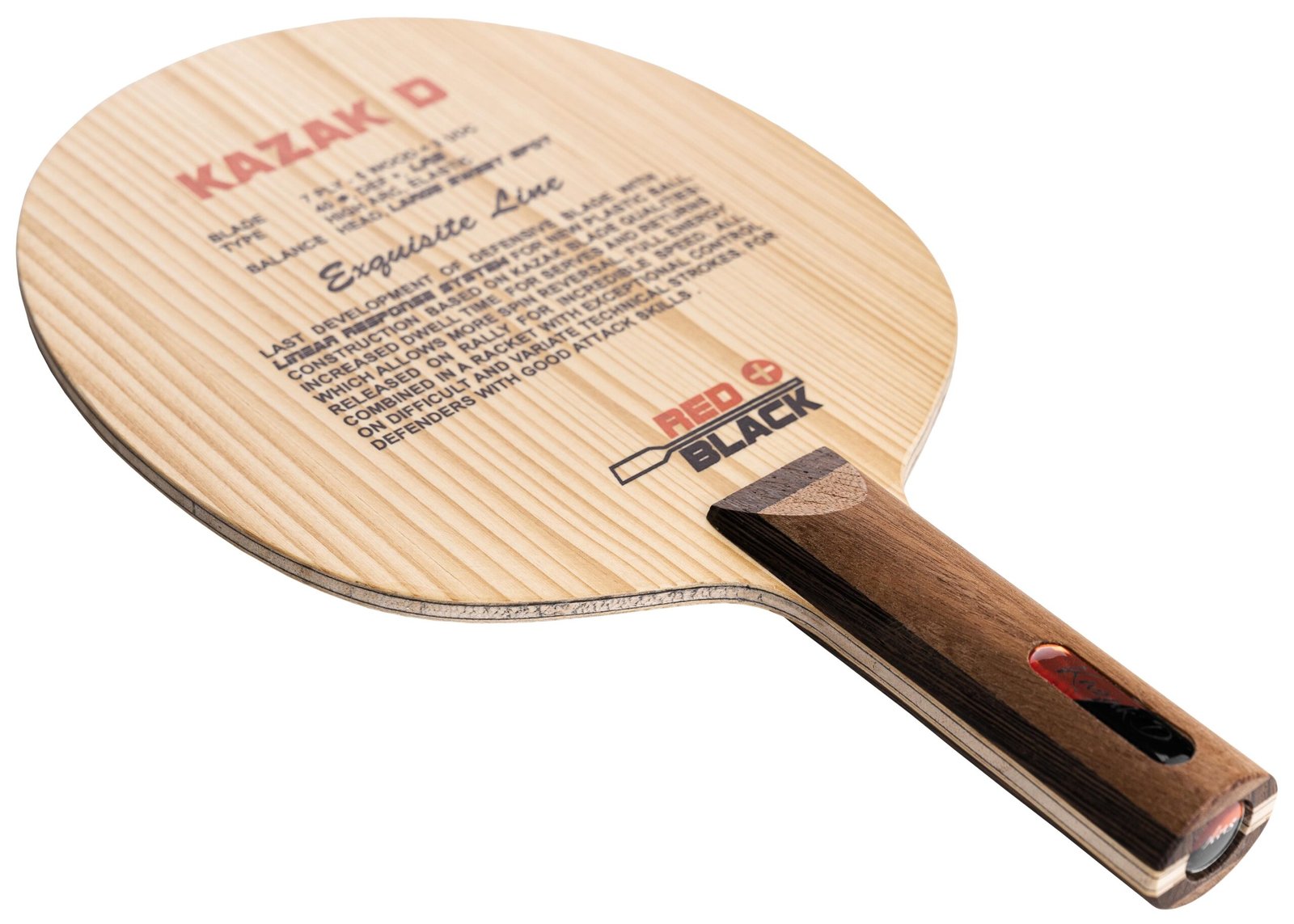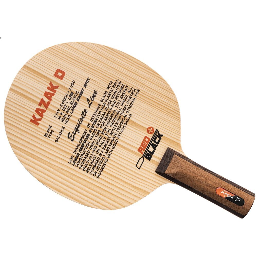 The Kazak D is the slowest and most defensive member of the Kazak series, purpose-built for modern defenders who seek control, spin, and occasional surprise attacks. Featuring a 5+2 inner soft-carbon construction, it delivers an exceptionally plush and muted feel that allows for deep dwell and heavy underspin. Weighing around 91 g with a slim 5.6 mm profile and a compact 157 × 151 mm head, the Kazak D enlarges the control zone, offering a high, safe arc on pushes and chops. The soft carbon adds just enough hidden energy to enable sudden counter-attacks, particularly with a well-timed forehand loop. Pair the backhand with long pips or frictionless pips to maximize spin reversal and placement disruption. For the forehand, a hard tensor or classic tacky Chinese rubber adds the punch needed to turn defense into offense when the moment is right.