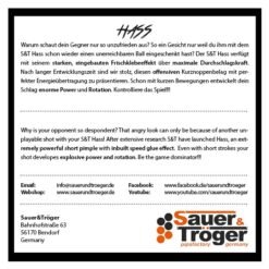 After extensive research S&T have launched Hass, an extremely powerful short pimple with inbuilt speed glue effect. Even with short strokes your shot develops explosive power and rotation.