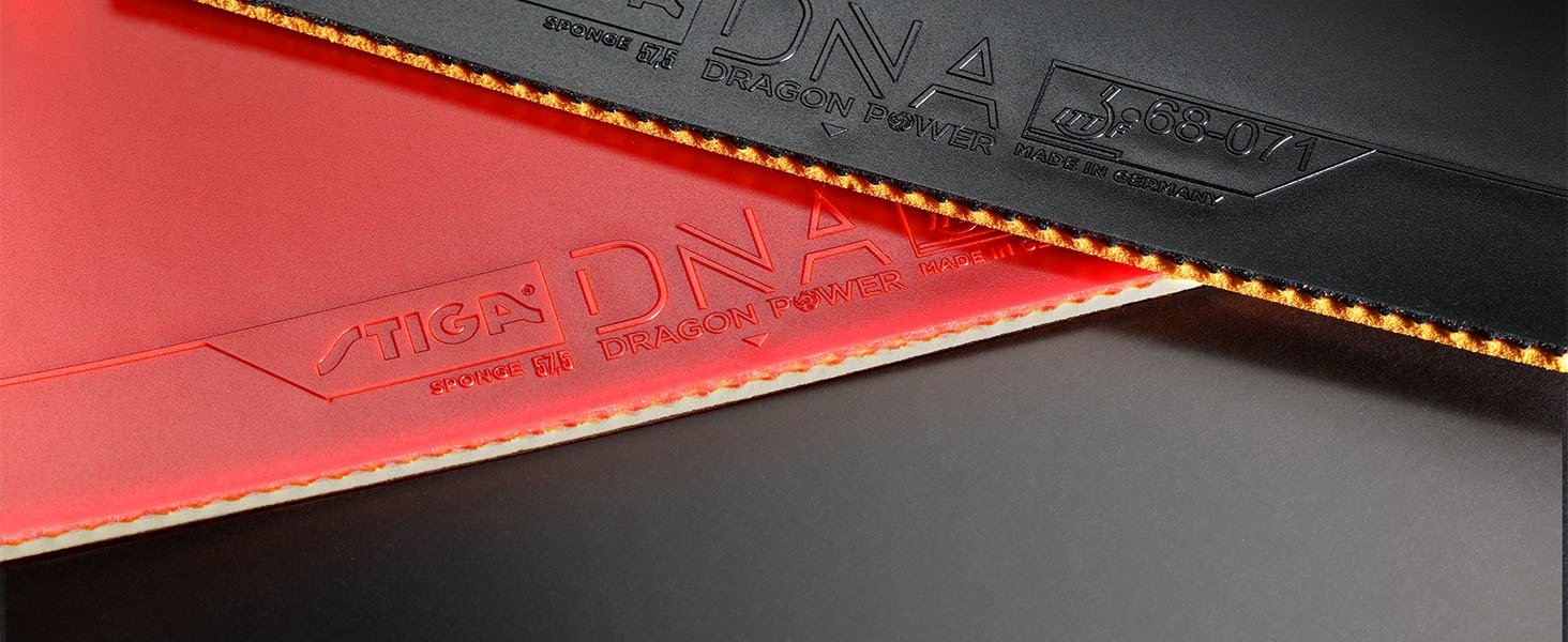 The Stiga DNA Dragon Power rubber, introduced in 2024, is a cutting-edge table tennis rubber designed to offer a unique combination of speed, control, and enhanced grip. A key feature is its high stickiness, which is particularly useful for generating heavy topspin and imparting more spin on the ball. This sticky top sheet works synergistically with the power sponge, designed to offer explosive speed and a catapult effect during offensive play. Available in different hardness levels (52.5, 55, and 57.5 degrees), the sponge offers a powerful rebound effect. The hardness of the sponge can be selected based on player preference for control versus power. A harder sponge will provide more speed and direct response, while softer sponges offer more control and dwell time on the ball. The hardest version – 57.5 degrees.