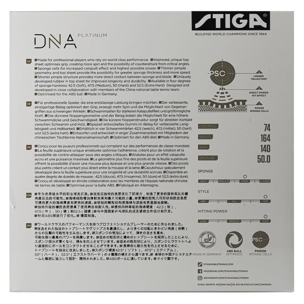 With a sponge of 50 degrees hardness, this is the hard version in the DNA Platinum series. According to Stiga product manager, Jens Lundquist, the Platinum series rubbers are much more advanced than the previous DNA Pro series and can without a doubt be used by the best world-class players. The shorter geometry of the inner pimples allows it to have the maximum sponge thickness of 2.3 mm. Made in Germany.