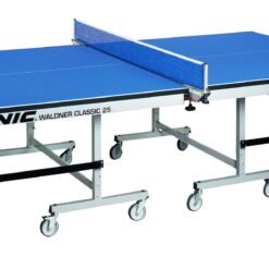 ITTF approved competition table with 25 mm top for a perfect bounce of the ball. Both table halves have a separate stable automatic undercarriage and a safety locking system. Technical Details: Top: 25mm in green or blue coated with improved lacquer Frame: Steel plate 60mm Legs: steel tube 40 x 40 mm, height adjustable Undercarriage: steel tube 40 x 40 mm. Easy movable wheels:100 mm with brake. Safety locking system. Delivery: partly assembled in carton (without net & post set) Weight: 124 kg (gross) Storage dimensions: 152,5 x 60 x 172 cm – (two tables only about 90 cm width) European norm DIN EN 14468-1 Made in Germany