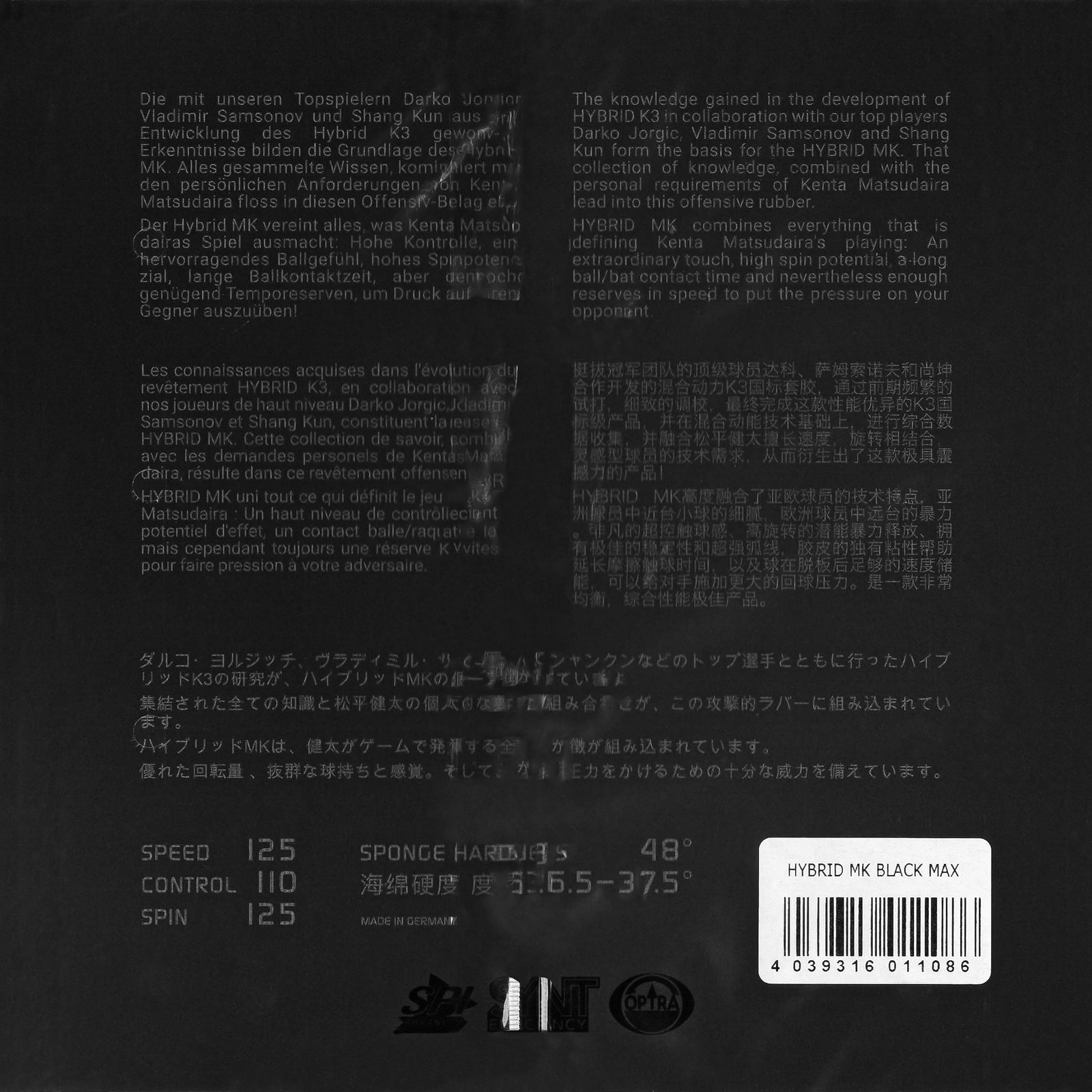 This hybrid rubber was developed by Tibhar together with famous Japanese player, Kenta Matsudaira, with the idea that Kenta would play with this rubber. Being hybrid means that the rubber is slightly sticky. The unique advantage of this high-class rubber is that, while it is not hard (48 degrees) and is quite light, it produces a great amount of spin and speed.